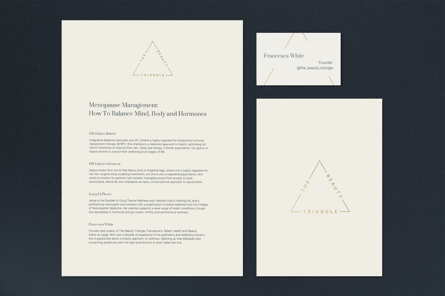 Brand identity for The Beauty Triangle, an organisation that connects audiences to best-in-class practitioners from the aesthetic and wellness industries.